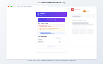 SEORadar는 SEO 전문가, 개발자 및 마케터를 위해 설계된 강력한 Chrome 확장 프로그램으로, 웹사이트 변경 사항이 배포되기 전에 SEO 문제를 식별하고 수정할 수 있도록 돕습니다. 이 도구는 사용자가 스테이징 사이트와 라이브 사이트를 비교할 수 있게 하여 업데이트가 검색 엔진 가시성에 해를 끼치지 않도록 보장합니다. 포괄적인 SEO 분석 및 실시간 문제 감지와 같은 기능을 통해 최적의 SEO 건강을 유지하기 위한 강력한 솔루션을 제공합니다.